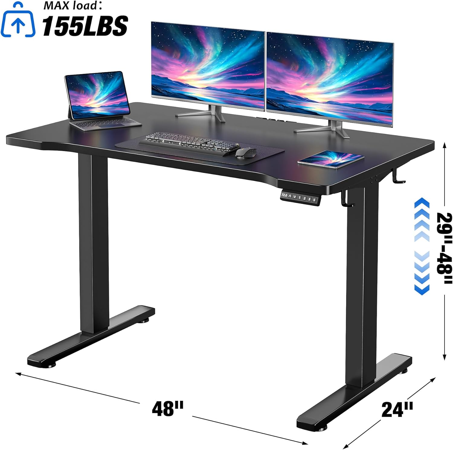 EnHomee Electric Standing Desk with LED Lights,48 x 24 Inch Height Office Desk with 3 Memory Preset, Adjustable Computer Desk with Storage Side Pocket and Cable Management,Black