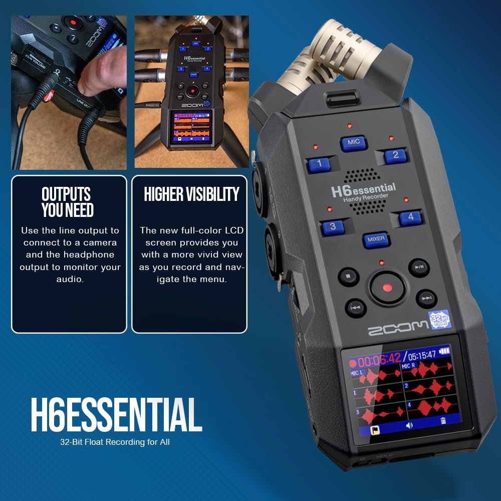 Zoom H6essential Portable Studio Recorder, H6E 32-Bit Float, 6-Track Recorder, 4XLR/TRS – 64GB SD, Tripod, Podcast Mic Pack, Rechargeable Batt, USB Cable & More-Musician Podcaster Filmmaker