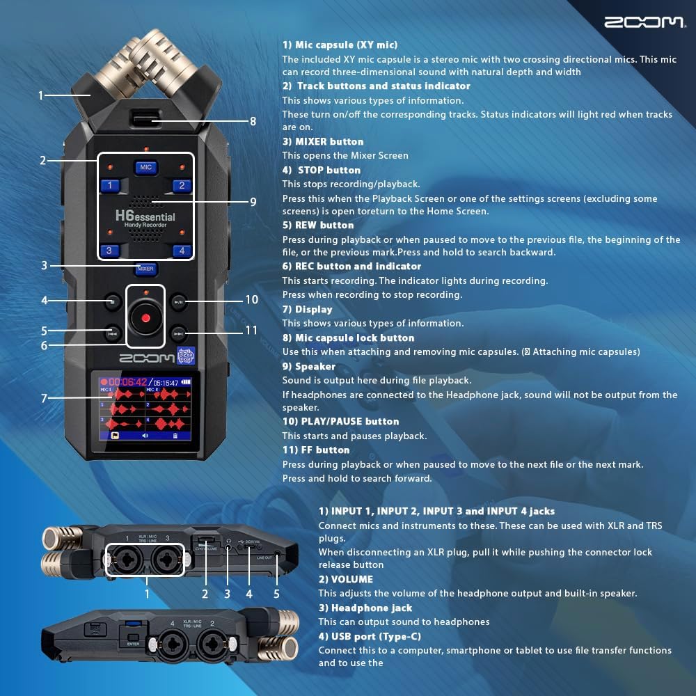 Comprehensive Set – This Zoom H6 Essential portable studio recorder includes SonicSound accessories – 4AA Rechargerbale Batteries And Charger, Microfiber Cleaning Cloth, Handgrip Tabletop Tripod, 4 XLR Cables M to F 10 feet, 64GB MicroSDXC Memory Card, USB 2.0 to C Cable 3ft=1m, 2 Set of Podcast Mic Pack with Headphones, Windscreen, XLR, and Tabletop Stand, Headphone Hanger.