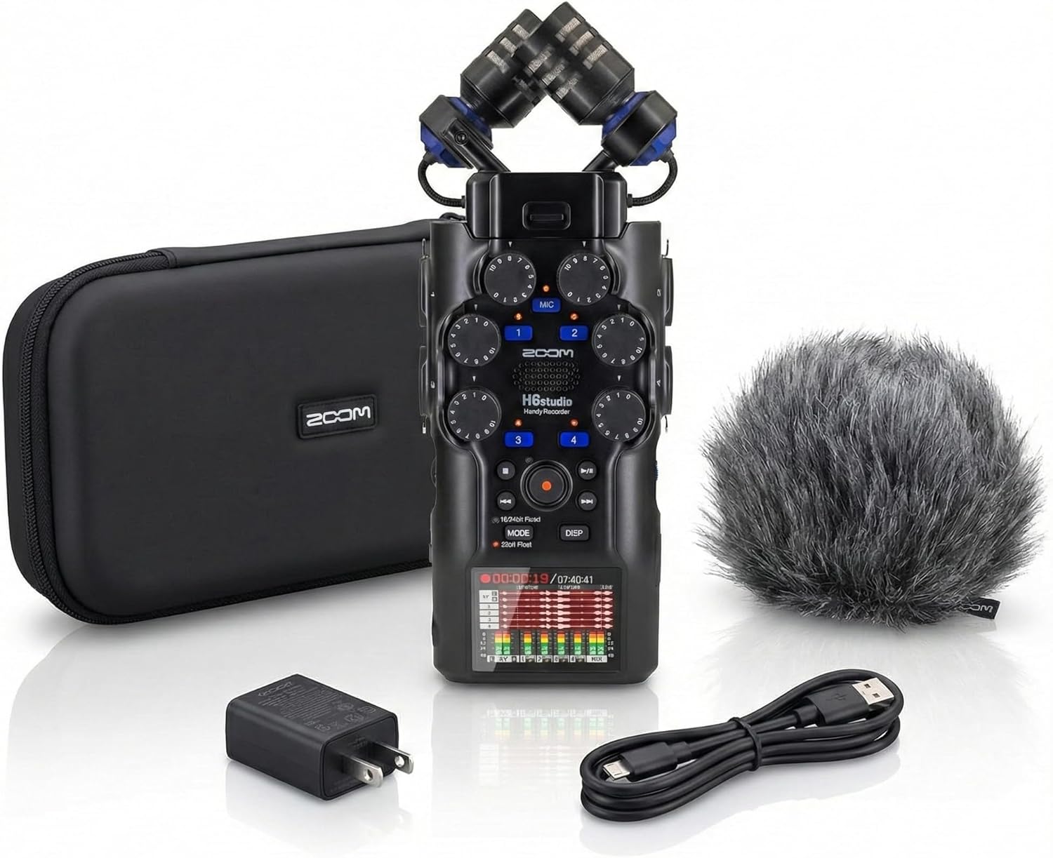Zoom H6studio 8-Track 32-Bit Float Handy Recorder Bundle with APH-6st Accessory Pack with Hairy Windscreen, Padded Shell Case, AC Adapter, & USB C-Cable (H6s + APH6st Accessory Pack)
